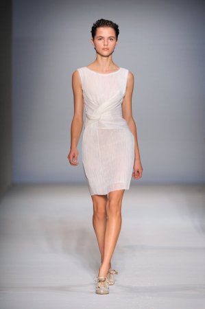 E’ sbocciata la nuova donna di Alberta Ferretti che per questa primavera / estate 2010 propone abiti trasparenti, leggeri e impalpabili tutti ricamati con fiori e paillette. Abiti creati con veli sovrapposti che celano il corpo femminile con pudore e grazia. I colori sono tenui come il beige, l’azzurro carta da zucchero e l’immancabile bianco. Le cinture sottolineano il punto vita, i pizzi sono romanticamente sovrapposti ai veli, per non lasciare il corpo nudo, le calzature sono per lo più basse con fiocchi di velo, quasi a voler esaltare la bellezza della candida donna di Alberta Ferretti.