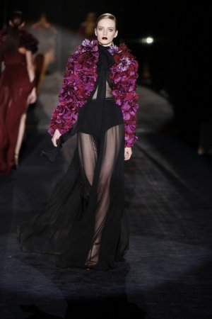 Gucci: nuvole di pelliccia colorata, trasparenze impalpabili, accenti maschili, tocchi in vernice da lady misteriosa ma sempre ironica. Per la stagione autunno/inverno 2011-12 la donna Gucci è una donna dalla personalità decisa, cesellata dalla cura dei dettagli. Vezzosi i tagli sartoriali e proporzioni seventies estremizzate. Le linee si allungano fino sotto il ginocchio e si svasano. Il lato maschile torna con pantaloni extra-wide e la gonna-pantalone.