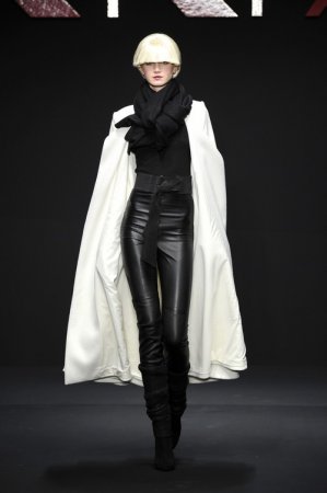Pierre Ancy: armature esteticamente belle e femminili, che vestono una donna forte. Ricami metallici su maglie e abiti di georgette in seta. Applicazioni di pietre nere, collane, bracciali, orecchini, montati su catene e reti metalliche dal sapore vagamente rock. I cappotti sono di panno e viscosa, dall’alta lavorazione sartoriale. La silhouette è esaltata da dettagli trasparenti nelle maniche e sulla schiena. La palette di colori è scura, dal nero, al blu, grigio e prugna.