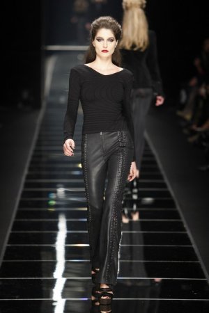 Emporio Armani: con il suo stile di spia internazionale, la donna Emporio Armani viaggia nel tempo e nel mondo in rigoroso total black, con un lampo di bianco artico. I tessuti utilizzati sono il panno, il velluto, la pelliccia di mongolia e per le più attente alla natura, anche quella ecologica. La silhouette è seducente, con i pantaloni ampi e sottili come una lama. I tagli sono a vivo, con giacche scolpite e bottoni nascosti o ricoperti. Unico lampo di colore, il rosa tenero della pelle nuda delle gambe senza calze, del collo scoperto e delle mani senza guanti che reggono borse dal perfetto design.