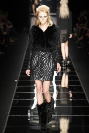 Gucci: nuvole di pelliccia colorata, trasparenze impalpabili, accenti maschili, tocchi in vernice da lady misteriosa ma sempre ironica. Per la stagione autunno/inverno 2011-12 la donna Gucci è una donna dalla personalità decisa, cesellata dalla cura dei dettagli. Vezzosi i tagli sartoriali e proporzioni seventies estremizzate. Le linee si allungano fino sotto il ginocchio e si svasano. Il lato maschile torna con pantaloni extra-wide e la gonna-pantalone.